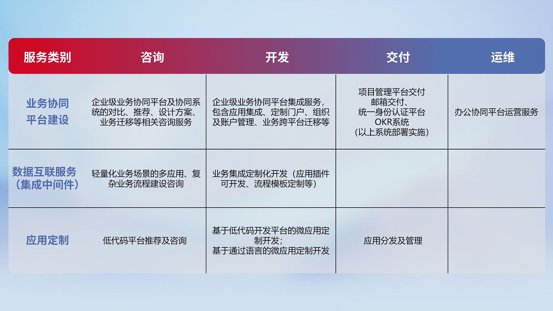 针对钉钉、、企微、、IDaas等平台级产品提供产品的规划、、、、方案、、、、交付、、定制化开发等服务,,,实现如统一协同办公、、智能客户服务、、、、混合会议管理、、、智能数据查询、、、等业务场景,,,,实现数字化转型。。。